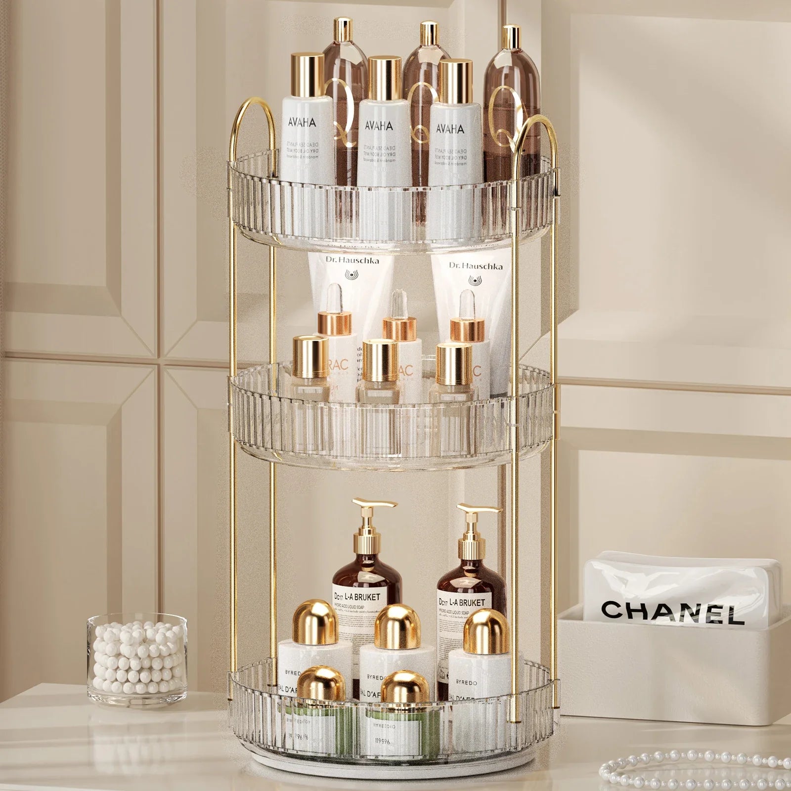 - Caractéristiques : Rotation à 360 degrés, grande capacité de stockage, installation facile, tiges métalliques transparentes, dorées et argentées.